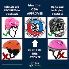 CSA approved hockey helmets are mandatory for skaters participating in our CanSkate and Advanced CanSkate programs. Bicycle, ski, snowboarding, skateboarding, or any other type of multisport helmet will not be permitted on the ice. Helmets must bear the CSA sticker and have a chin strap.